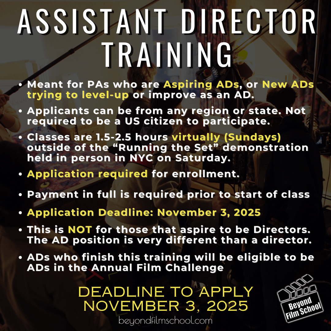 The reason we do this is to make sure each applicant is aware of the type of course they are signing up for – as this is NOT for those who want to be Directors, Writers, and Producers. (You may have those goals down the line and we encourage it, but you have to want to be an Assistant Director first and foremost.) This program is for those that love the Assistant Director position, and strive to be great ADs’.
